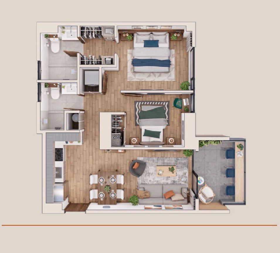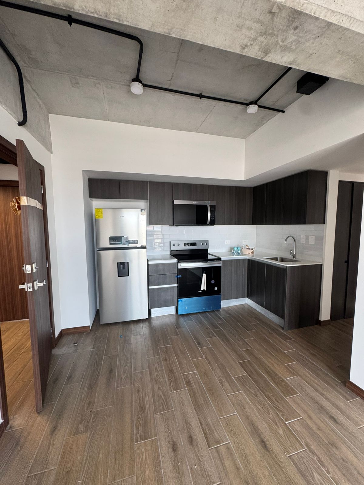 Incluye: refrigeradora, estufa con horno, microondas/extractor y torre de lavado (lavadora y secadora), chapa electrónica, mamparas y espejos con luz en baños, y cortinas.
