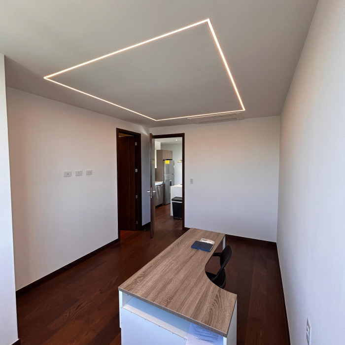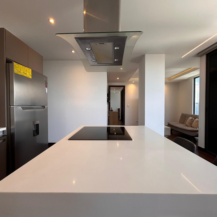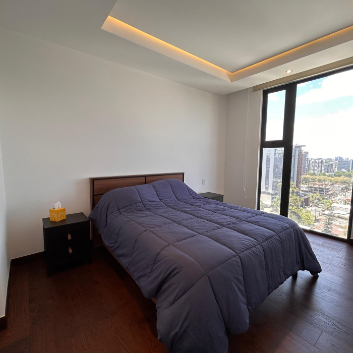 2 habitaciones (cada una con su baño privado)Sala y comedor integradosCocina totalmente equipadaAmplio balcón con vista espectacular2 estacionamientos