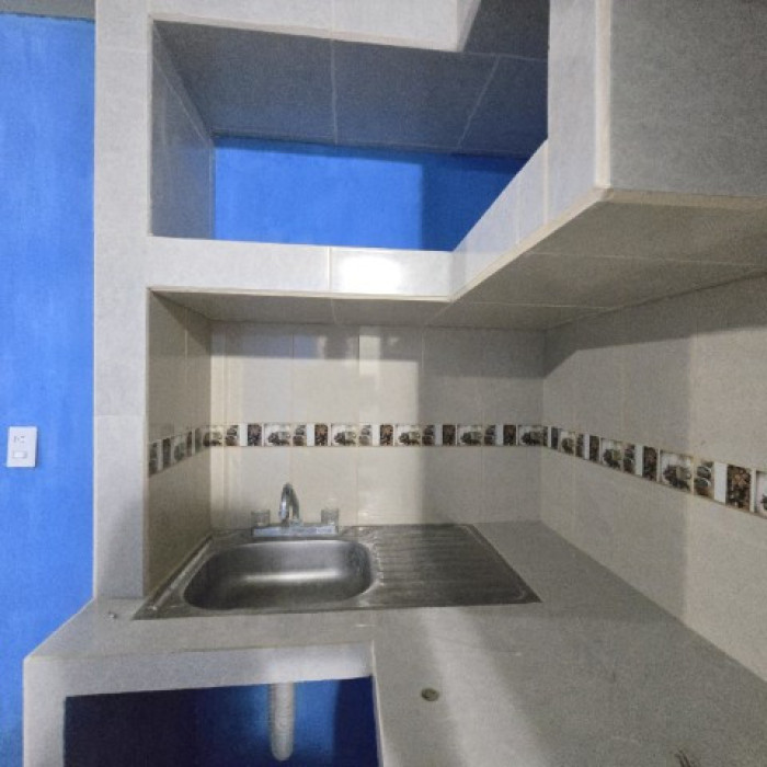 Gabinetes en la cocina, patio con pila.