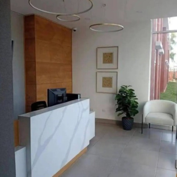 Gabinetes y top en la cocina. Además, incluye lavadora – secadora y calentador general de agua.