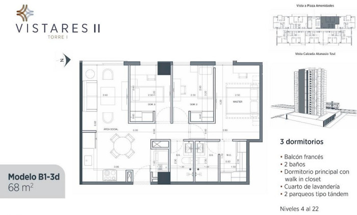 2 parqueos tipo tándem mas 1 parqueo adicional en el mismo nivel de sotano.