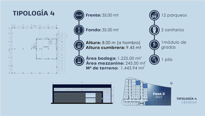 Bodega amplia con excelente capacidad y distribución, ideal para operaciones logísticas, almacenamiento o uso industrial.Ofrece infraestructura diseñada para facilitar las operaciones empresariales, contando con garita de seguridad, áreas verdes, comedor y baños para personal, parqueo para motocicletas y parqueo para visitas.Vía de conexión a Ciudad de Guatemala por VAS (Boca del monte) - 7.3kmConexión hacia Ciudad de Guatemala por VAS (Carretera a El Salvador) - 12.2kmTramo a ciudad de Guatemala por VAS (Calzada Atanasio Tzul) - 13.4kmVía de conexión a Carretera El Pacífico VAS (Amatitlán)(Amatitlán) - 11.8kmCaracterísticas de la Bodega:Frente: 35.00 mFondo: 35.00 mÁrea de bodega: 1,225.00 m²Área de mezzanine: 245.00 m²Terreno total: 1,443.94 m²12 parqueos1 pila1 módulo de gradas2 sanitariosGarita Área verde Comedor y bañosParqueo de motocicletasParqueo de visitasInstalaciones Área de parqueo de furgonesEnganche 30%Reserva Q40Mil . - Código de Inmueble: PVOB-014-03-26-3