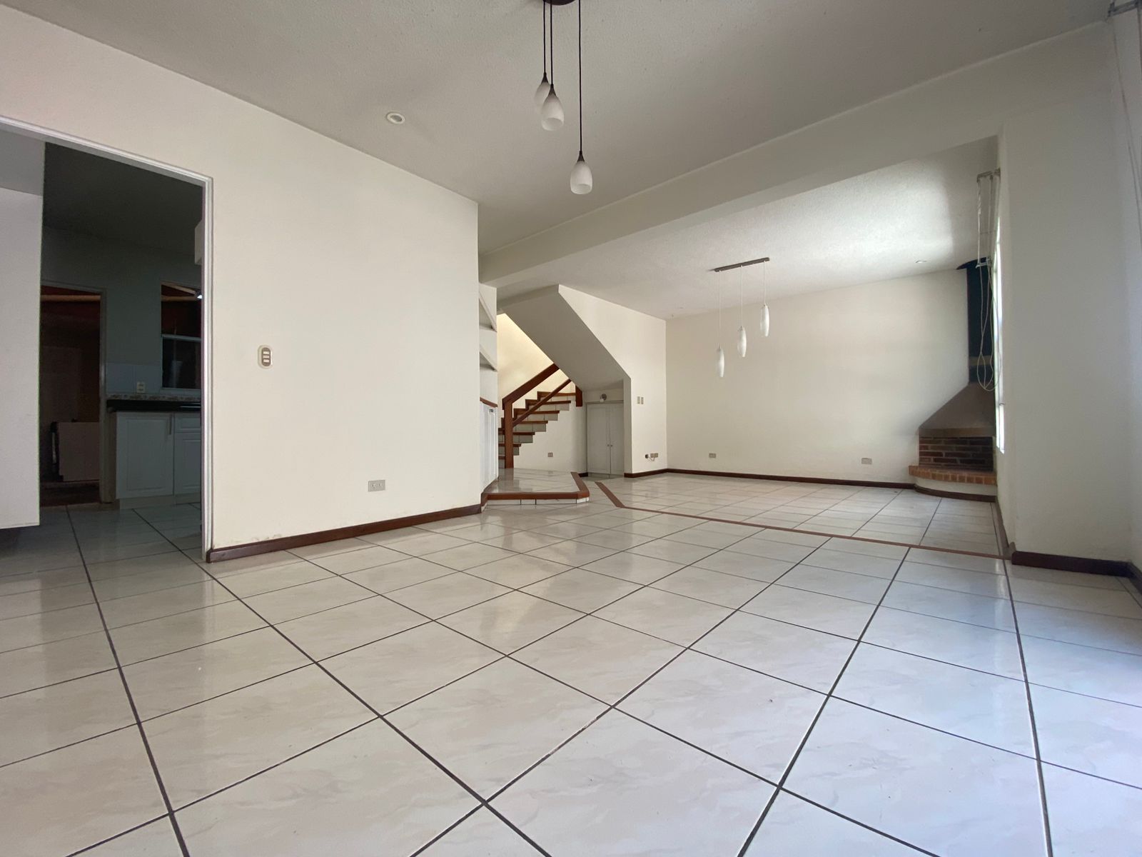 Sala-comedor con chimenea, cocina, estudio, 1/2 baño de visitas, bodeguita bajo la escalera, área de servicio con baño, lavandería, patio interno techado, patio trasero con churrasquera, carport techado para 2 vehículos.