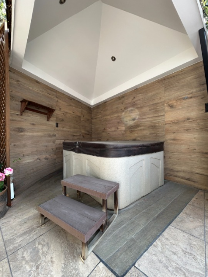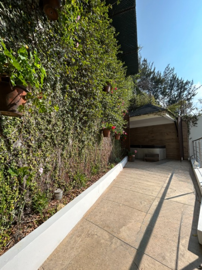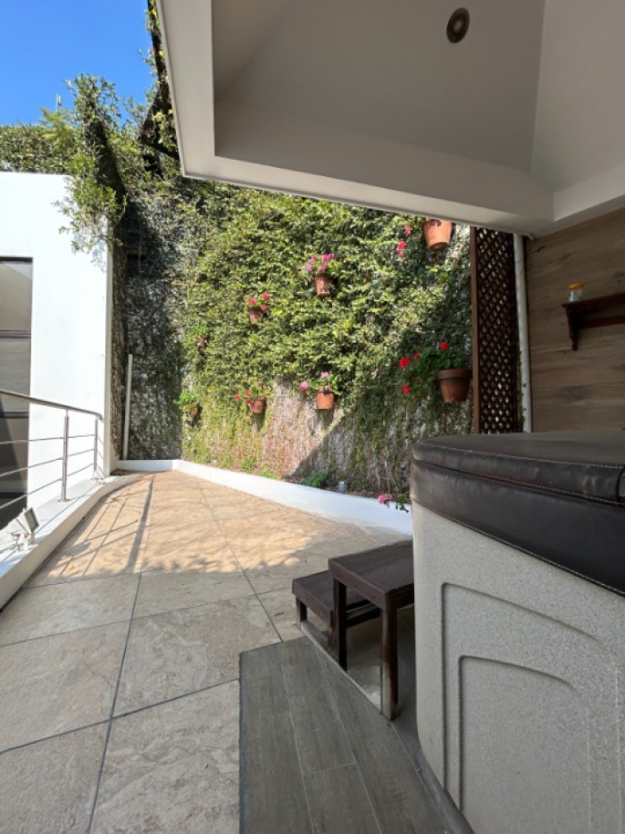 clóset y baño con jettina- Sala familiar- Amplio balcón- Pequeño jardín con jacuzzi