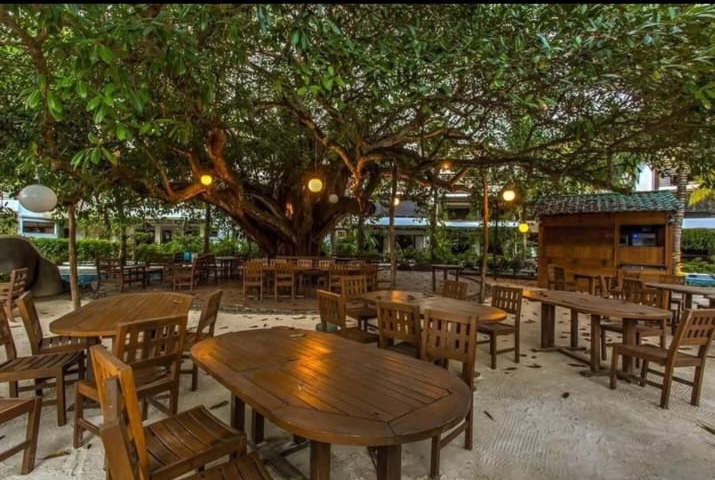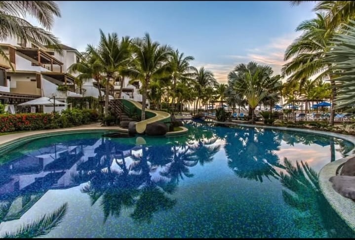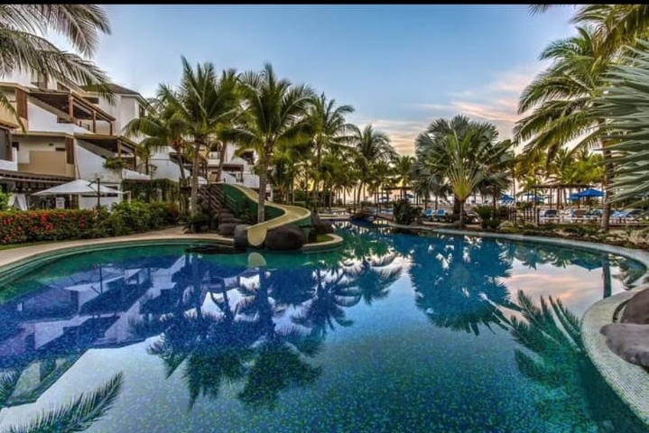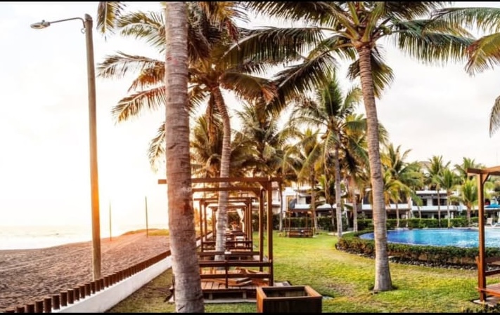 El complejo se encuentra justo frente al mar en la aldea El Gariton y cuenta con piscinas, toboganes, áreas comunes y restaurante.